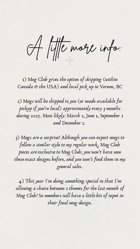 -Mugs will be shipped (or available for pickup if you're local to Vernon, BC) one at a time over the course of the next 12 months. Dates are: March 1, 2026 / June 1, 2026 / September 1, 2026 & December 1, 2026.